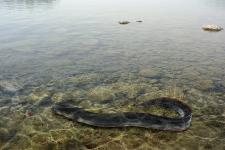 long eel on background of bottom of lake
