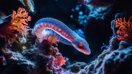 Close up view of an eel on a coral reef at night