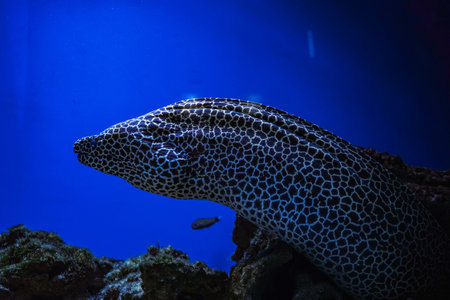 Close up of a geometric moray eel swimming in a large aquarium, showing its unique patterns and dark coloration