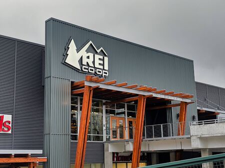 Bellevue, WA / USA - circa November 2019: Exterior view of an REI Co-Op store, selling outdoors and recreation clothing and gear