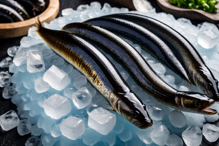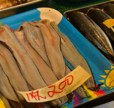 Fresh eel seafood on crushed ice at fish market. Fresh frozen on store counter in hypermarket. Frozen sea fish on display counter at store. Concept of retail food backgrounds. Copy ad text space