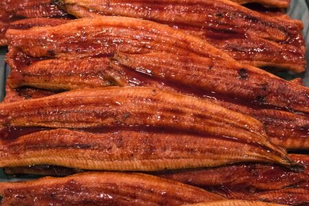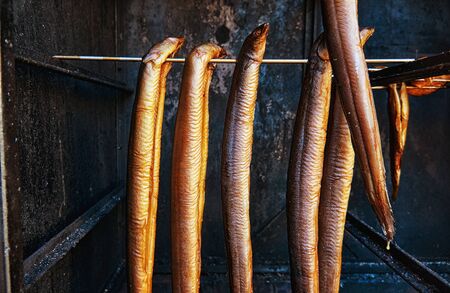 Freshly smoked eel in the smoker. Anguilla Anguilla.