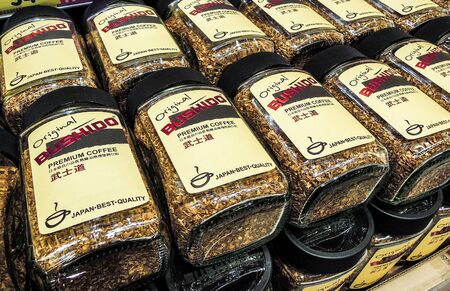 Samara, Russia - November 23, 2019: Coffee Bushido ready for sale on the shelf in supermarket