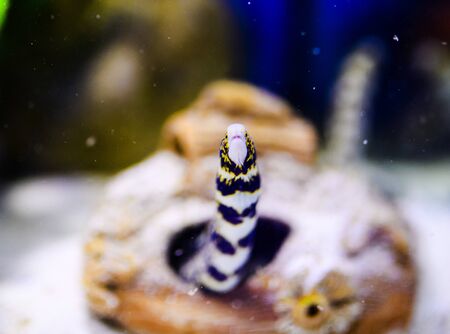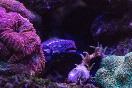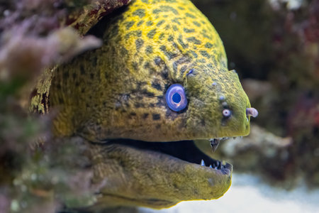 Spotted Moray Eel with open mouth in a coral reef in the aquarium close up