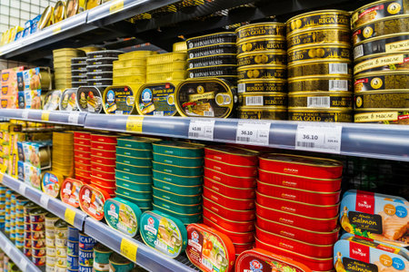 April 13, 2023 Beltsy, Moldova. For illustrative editorial use. Canned fish