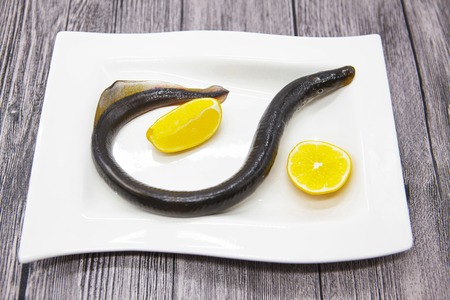 Fish market in Busan, South Korea. Live eels in aquarium at Jagalchi Fish Market.