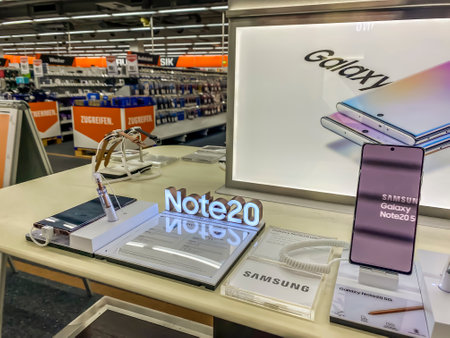 Darmstadt, Germany - 17th August 2020: A german photographer visiting the a shopping mall, taking pictures of the new Samsung Galaxy NOTE 20 smartphones within the SATURN electronic market.