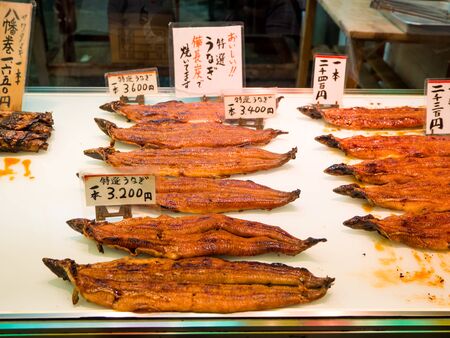 KYOTO, JAPAN - October, 2016: Various food in the Nishiki market the large market in Kyoto city on October, 2016
