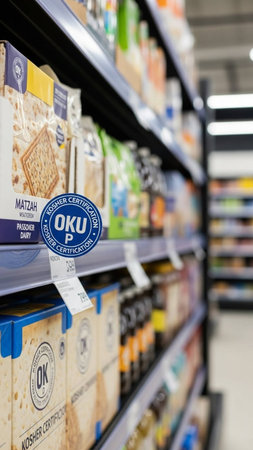 Panoramic view of a department in a supermarket. Various products on the shelves of a supermarket. Grocery store.