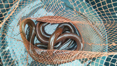 New Zealand Long fin eel gathering in stream writhing and slimy.