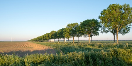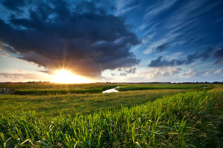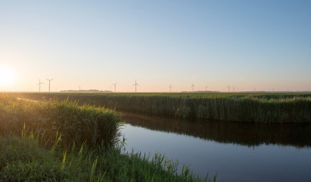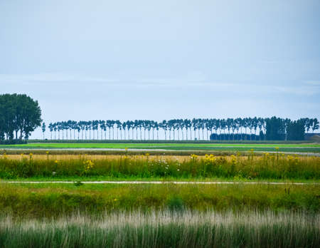 Dutch polder landscape during sunrise with riparian plants, meadows and flowering herbs against clear blue sky with clouds veil. The Netherlands.