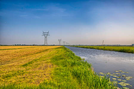 Steinse Tiendweg hiking trail in the polders east of Gouda, the Netherlands, with canals, ditches, meadows and electricity pylons