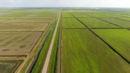 Growing rice on flooded fields. Ripe rice in the field, the beginning of harvesting. A birds-eye view. Flooded rice paddies. Agronomic methods of growing rice in the fields. Flooding the fields with water in which rice sown.
