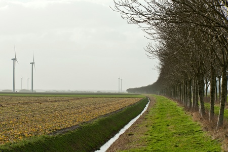 Windmills along the flower bulb fields in the head of Noord-Holland in the Netherlands.