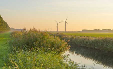 Canal with a rural landscape in sunlight below a blue sky at sunrise in autumn
