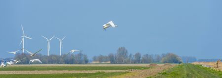 Swans flying over a green agricultural field in a blue sky in sunlight in spring