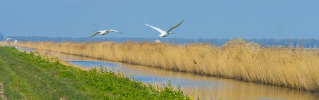 Two swans flying over the edge of a canal with reed below a blue sky in sunlight in spring