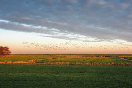 Flocks of geese above the island of Marken during sunrise in The Netherlands