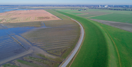 Aerial view of Coastal region with dike of IJsselmeer near Zwarte Water, Zwartsluis, Overijssel Province, the Netherlands. Landscape scene in nature of Europe.