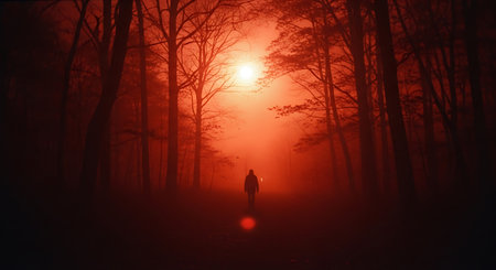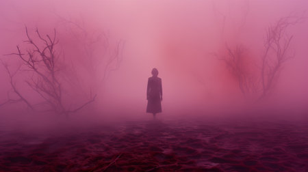 a person stands in a red fog in a forest, creating a haunting and psychologically horrifying atmosphere. the image is inspired by tenebrism and depicts trapped emotions. the monochromatic color scheme adds to the eerie ambiance. perfect for halloween, this photo captures the beauty of darkness. ai generated