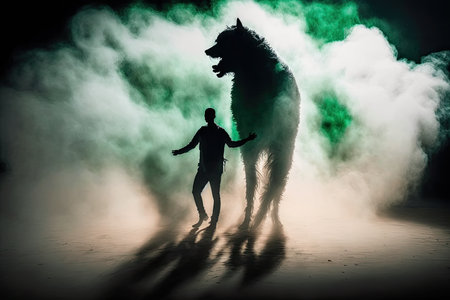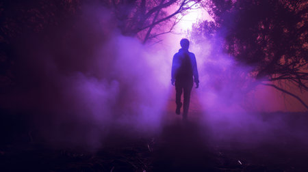 Shadowy figure of man in mist creates a haunting ambiance. Concept Mysterious Silhouette, Eerie Mood, Spooky Scene