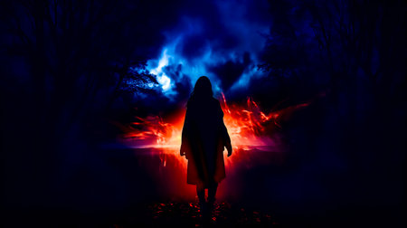 Mysterious dark forest with fog and silhouette of a man in a red cloak