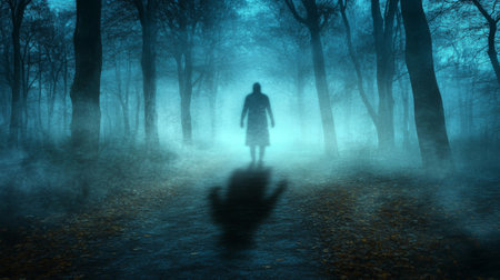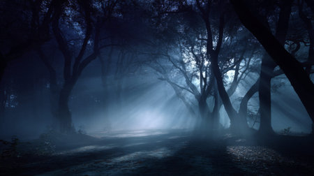 Enigmatic shadowy woods shrouded in fog, creating a spooky Halloween atmosphere with eerie trees.