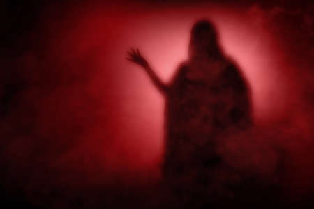A devilish silhouette from Hades shrouded in mist illuminated from behind.