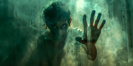 dark, foggy setting, spectral hands reach in from the edges, almost touching him, reflecting anxiety or haunting memories. Generative AI