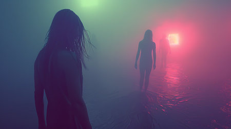 Mysterious hooded figures walking through fog create an eerie and haunting atmosphere. Ai generated image