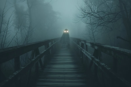 Spooky ghost with glowing eyes is standing on a foggy bridge in a dark forest at night