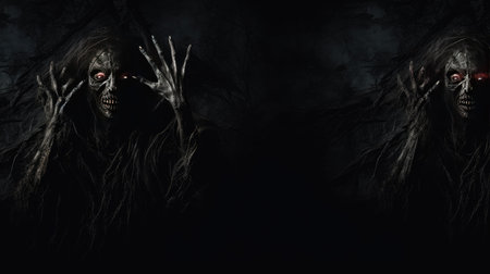 Shadows blend into a dark, abstract background as mysterious silhouettes hint at an eerie presence, invoking feelings of fear and uncertainty.
