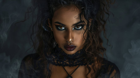 Captivating Gothic Inspired Portrait of a Mysterious and Alluring Young Woman with Dramatic Makeup Ornate Accessories and a Brooding Cinematic Atmosphere