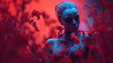 Gothic Woman in Red Lighting with Dramatic Makeup