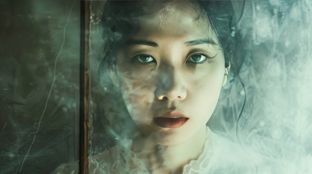 Creepy portrait of an Asian woman as a ghost, perfect for horror scenes and posters.
