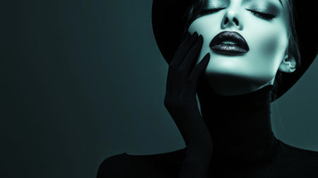 A stylish monochrome portrait of a woman with dramatic lighting, wearing dark clothing and posing with elegance. The image emphasizes high fashion and mystery.