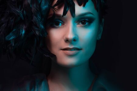 Beautiful young woman in mysterious emerald light. Hat of black feathers, fashion and the image of the luxury make-up