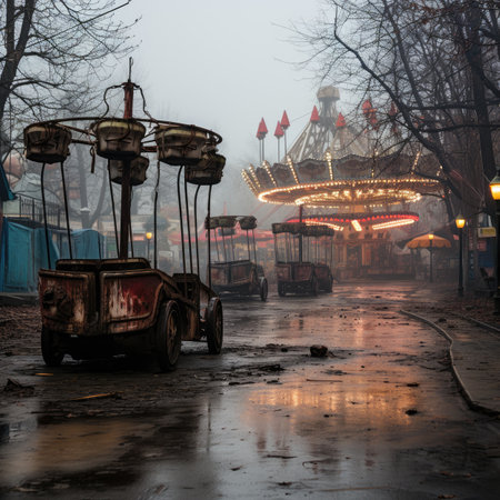A haunting abandoned amusement park stands still at dusk, its eerie silence contrasting with memories of laughter and thrills