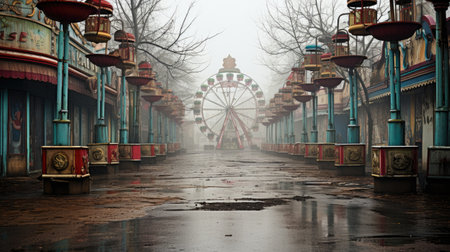 foggy street with decayed buildings and a ferris wheel, capturing the kitsch and camp charm of a french landscape. this national geographic photo showcases the beauty of decay in 8k resolution, with rusty debris and a soggy atmosphere adding to the captivating scene. ai generated