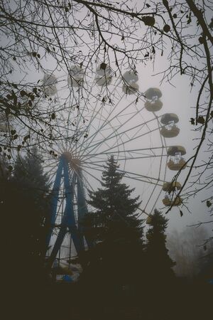 Ferris wheel in an old abandoned park in the autumn in thick fog.