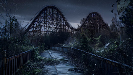 A once thrilling rollercoaster now abandoned and reclaimed by nature stands eerily against the night sky Moss covered tracks and a decaying structure are enveloped by a lush overgrown landscape