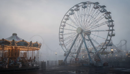 Morning fog envelops a detailed Ferris wheel in clear focus while a carousel and other rides fade softly into the misty background
