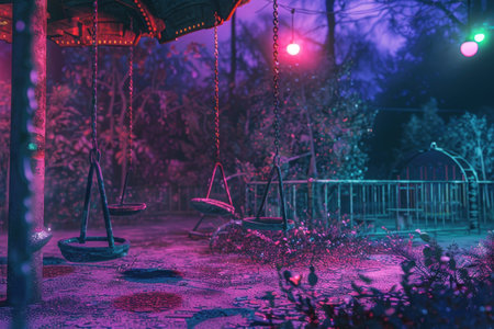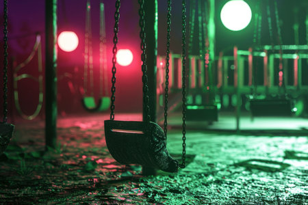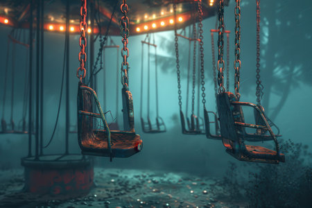 A park with a rusty swing in the abandoned amusement creepy atmosphere