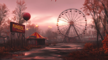 Abandoned amusement park at dusk, surrealistic style, eerie and nostalgic