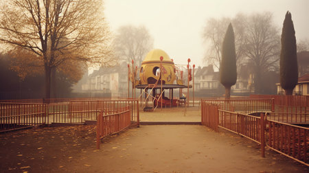 an abandoned park in an empty city, captured in a misty and carnivalesque style. the photo showcases a combination of light cyan and maroon tones, creating a grim realism. shot with a carl zeiss distagon t 15mm f/2.8 ze lens, this gloomy image resembles a scene from a national geographic documentary. ai generated