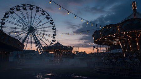 An amusement park comes alive at twilight with lights illuminating a ferris wheel and carousel. The moody, slightly misty atmosphere and wet ground add a cinematic and nostalgic feel to the fairground.
