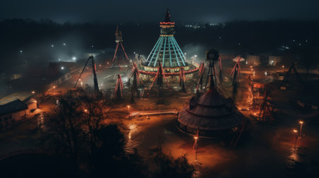 Abandoned amusement park night drone view