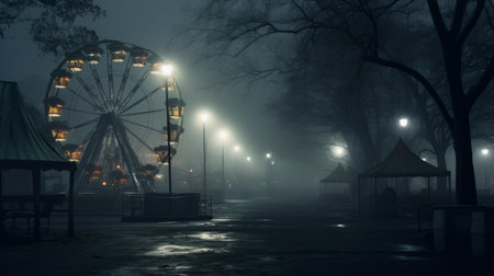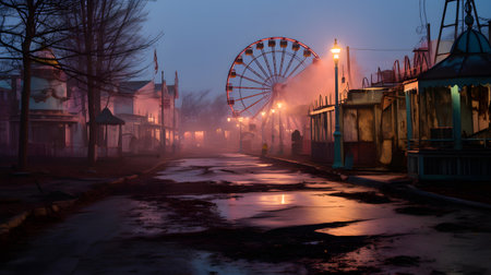 Abandoned carnival grounds with a foggy atmosphere and moonlight