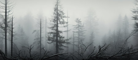 Misty forest landscape with dark green trees in deep fog. Mysterious nature scene and abstract background for tranquil mood.