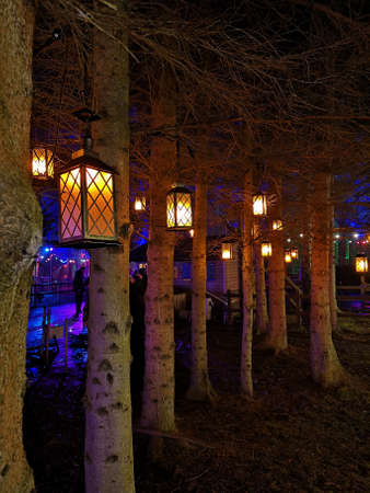 A night time view of an illuminated area of woodland with Christmas lights and decorations in Dalkeith Country Park in Scotland.